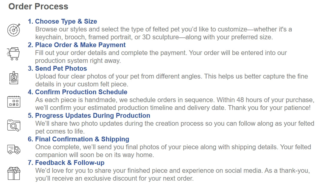 We’d love to see a photo that really captures your pet’s unique personality—something that shows their spirit and charm. Feel free to let us know if you picture them with specified gesture, eg. their mouth open in a happy grin or gently closed. Natural lighting helps us match their true coat color as closely as possible, so try to choose a well-lit photo taken in daylight.